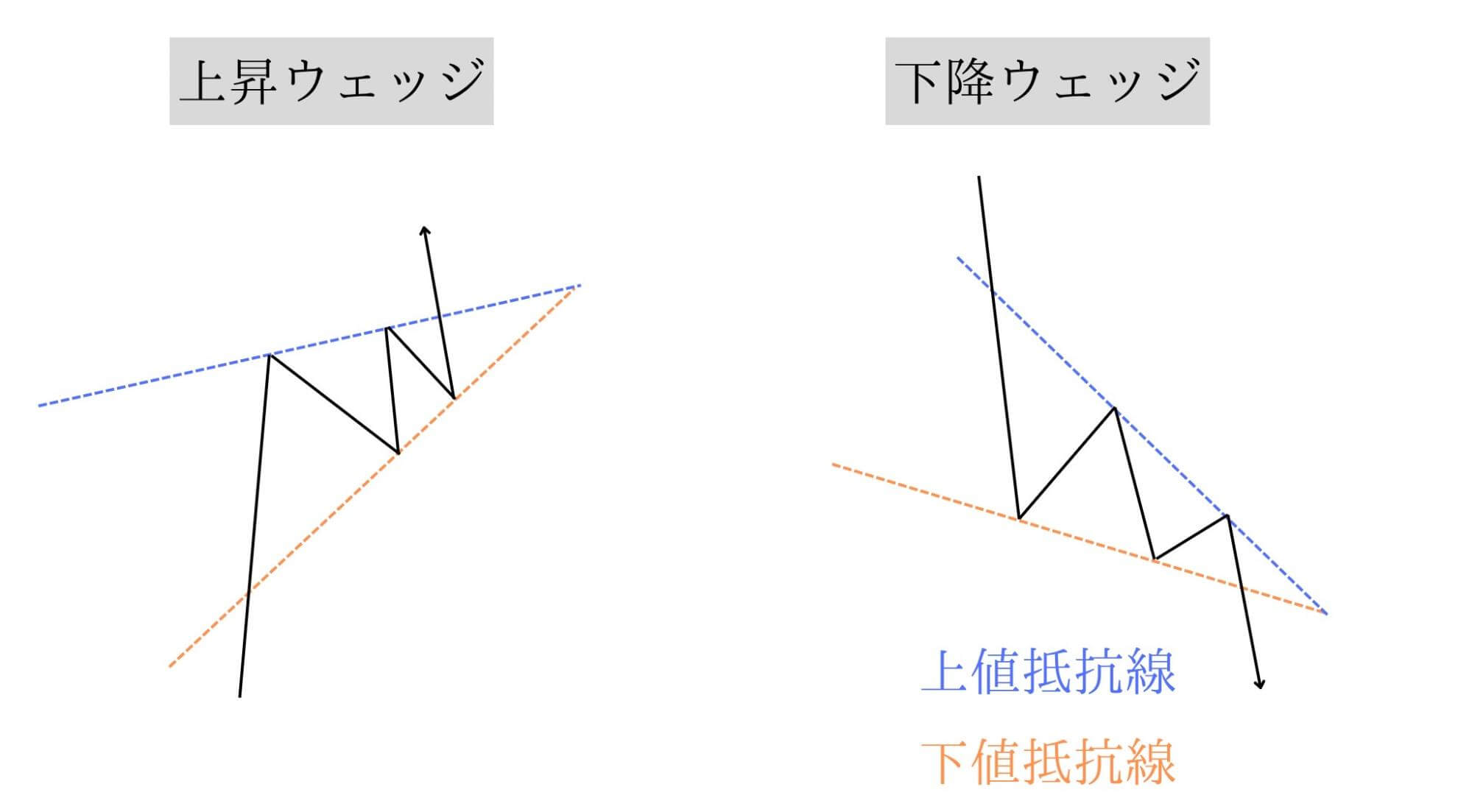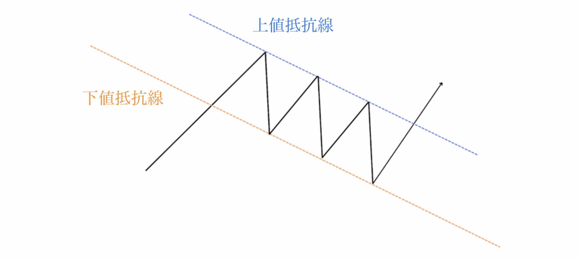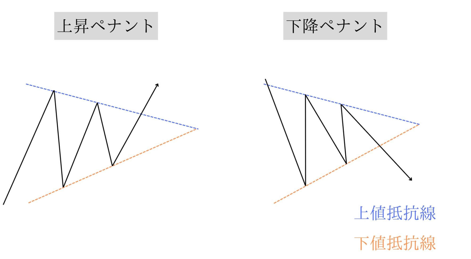 フラッグに似ていますが、上限が切り下がり、下限が切り上がっていくことで抵抗線が平行にならずに延長線上で交わる点が異なります。