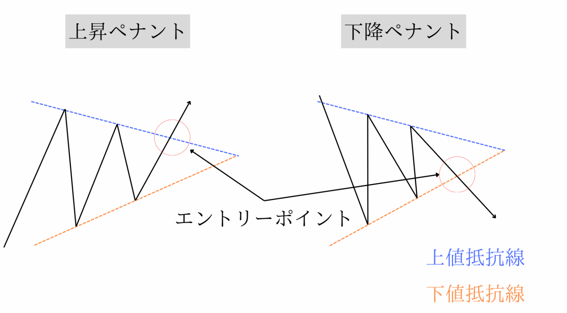 たとえば、ペナントはトレンドの中で形成され、三角形のペナントの先の三角形の形状が上向きに細くなっていき、抵抗線を抜けたあたりがエントリーポイントとなります。