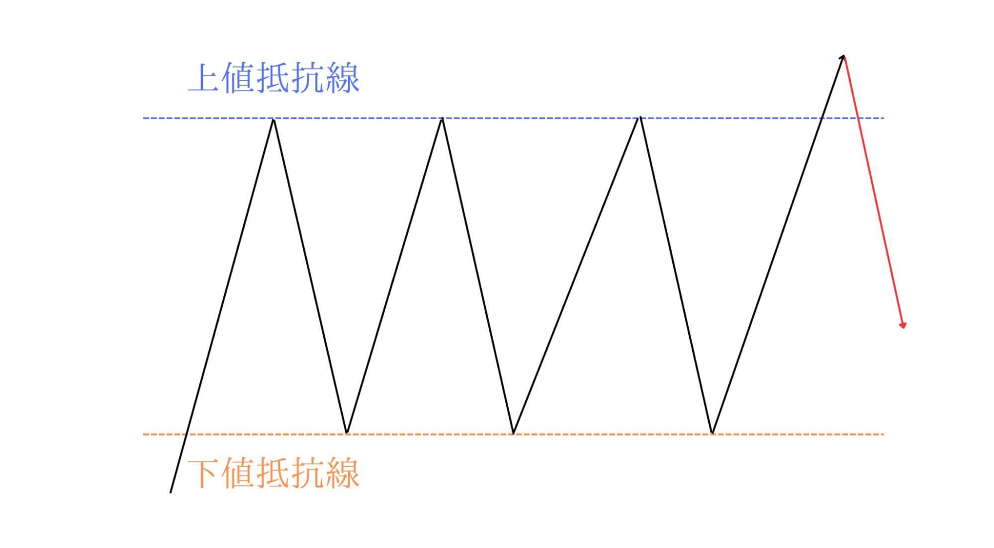 レンジ相場から上値抵抗線をブレイクしエントリーしたものの、何らかの理由で再び下落しレンジ相場に突入するパターンです。