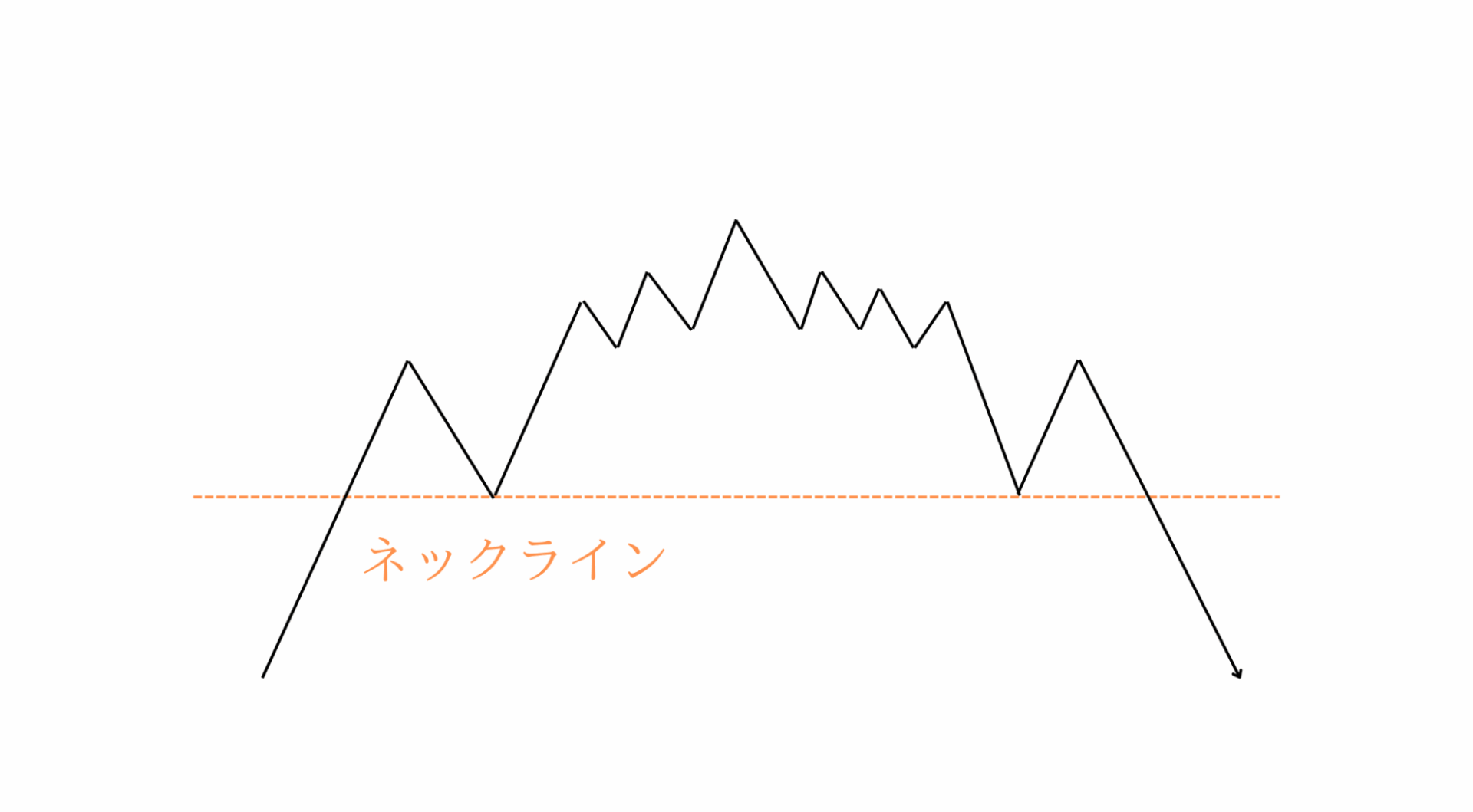 ヘッド&ショルダーズトップのエントリーポイントは、3つ目の山を越えネックラインを割ったタイミングです。