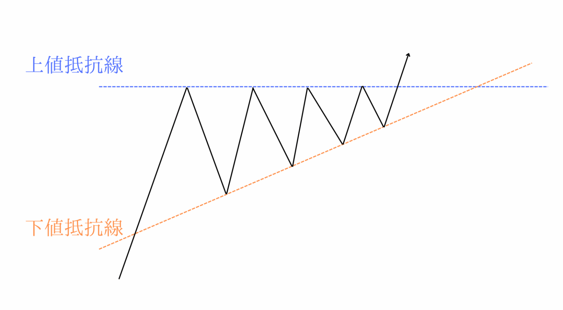 上限を一定の価格を保ちながら下値が切りあがる形状をアセンディングトライアングル(上昇トライアングル)といい、上値抵抗線を突き抜けた時が買いのエントリーポイントになります。