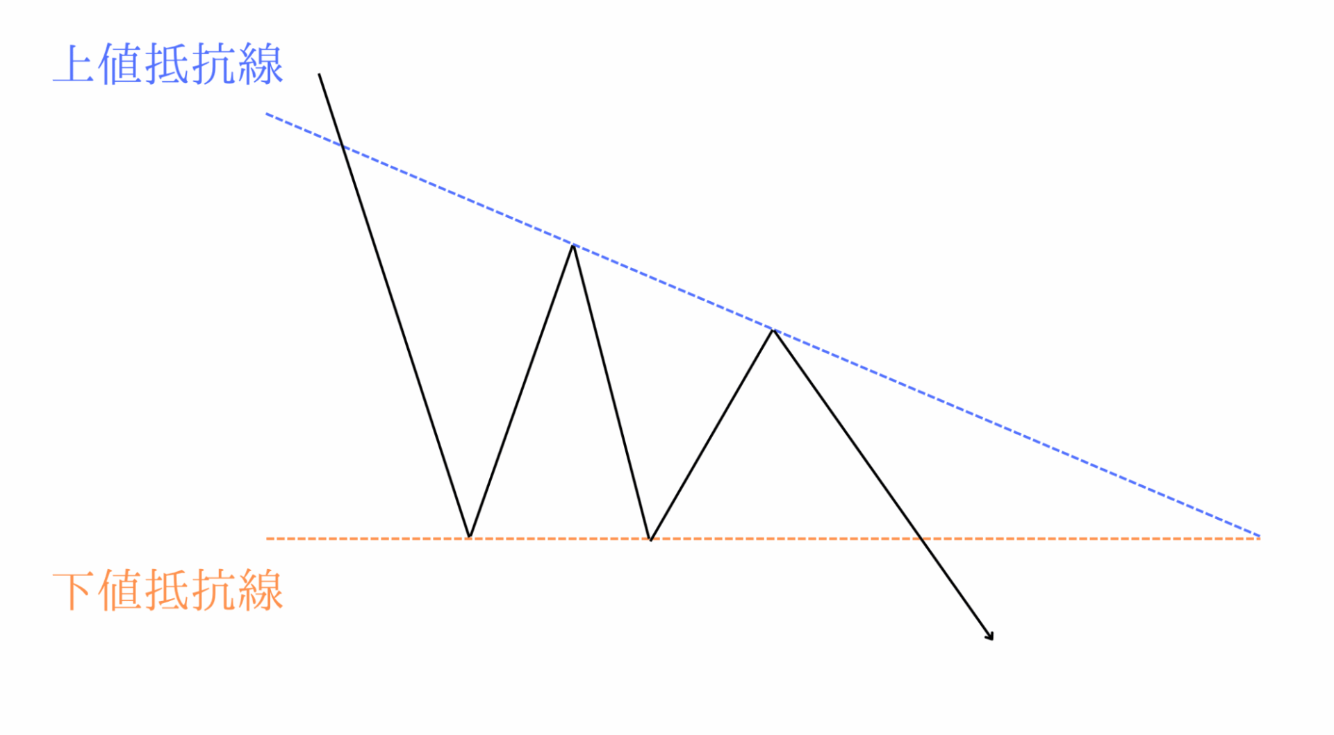 下限を一定の値に保ちながら上値が切り下がっていく形状をディセンディングトライアングル(下降トライアングル)といい、下値抵抗線を下に突き抜けた時が売りのエントリーポイントです。