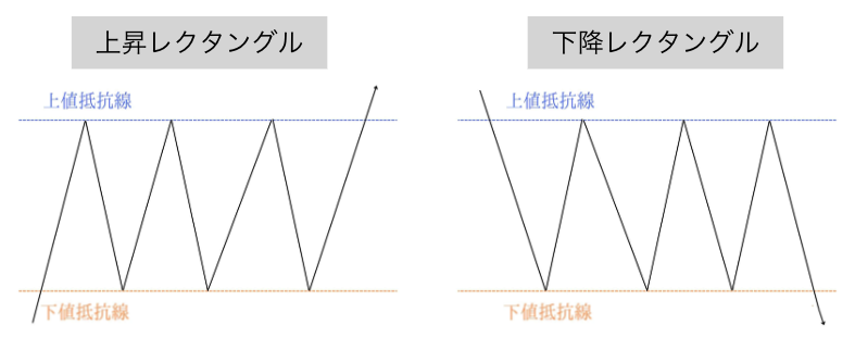レクタングルとは英語で長方形という意味で、一定の値幅で上値と下値が平行に推移し、長方形を形成していきます。