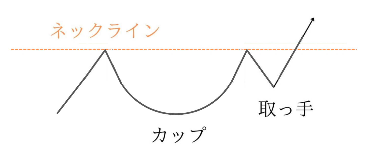 カップ&ハンドルは、強い上昇トレンドが発生する前兆とされるチャートパターンで、カップウィズハンドルとも呼ばれています。