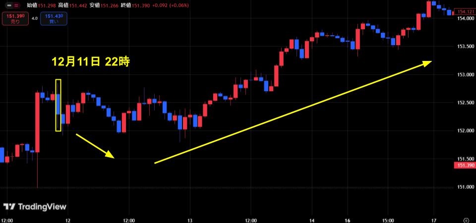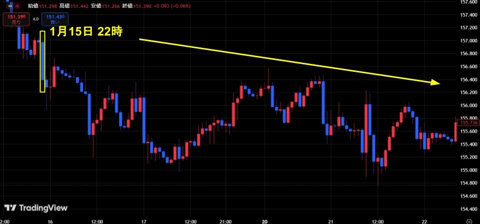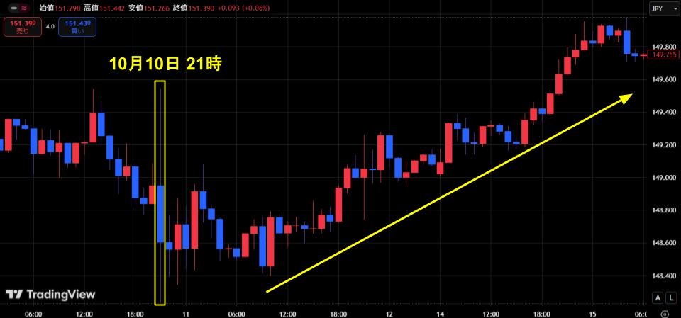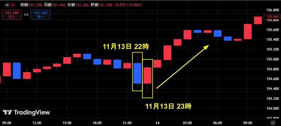 米ドル円の1時間足チャートを見ると、発表当時は大きな価格変動が見られ、その後ドル高円安の動きが顕著になりました。