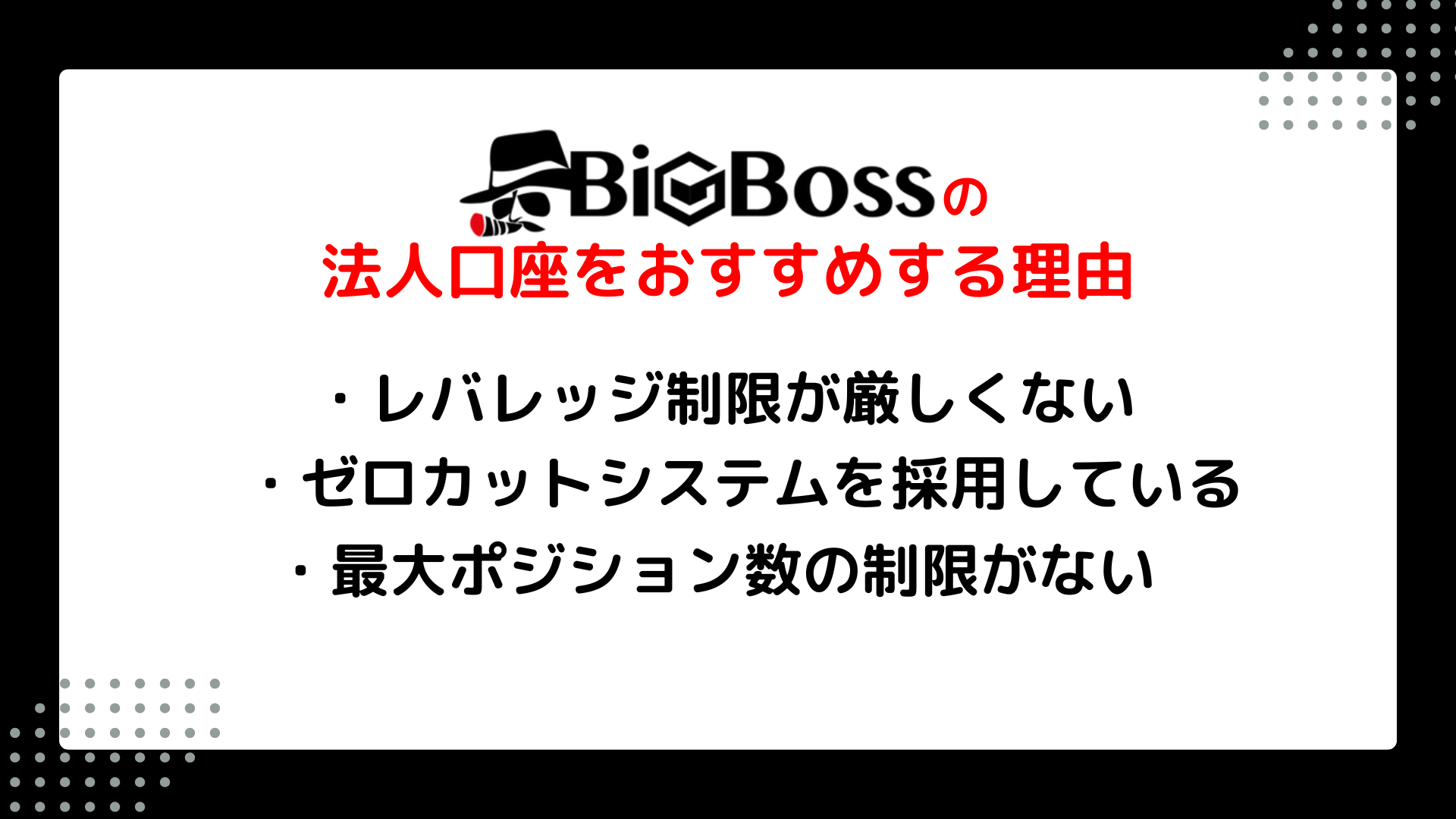 法人口座の開設を検討している方には、海外FX業者のBigBossがおすすめです。