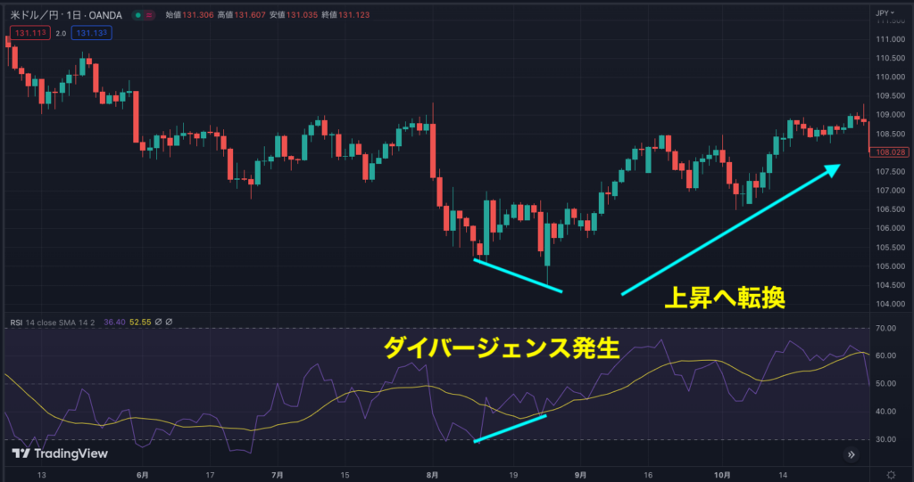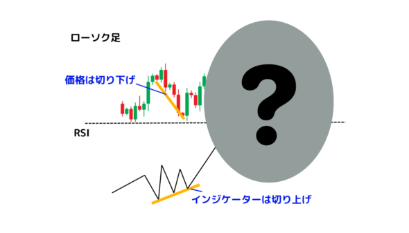 下図のようにチャートは安値を更新している一方でインジケーターが安値を切り上げているときは、上昇トレンドに転じる可能性があると判断できます。