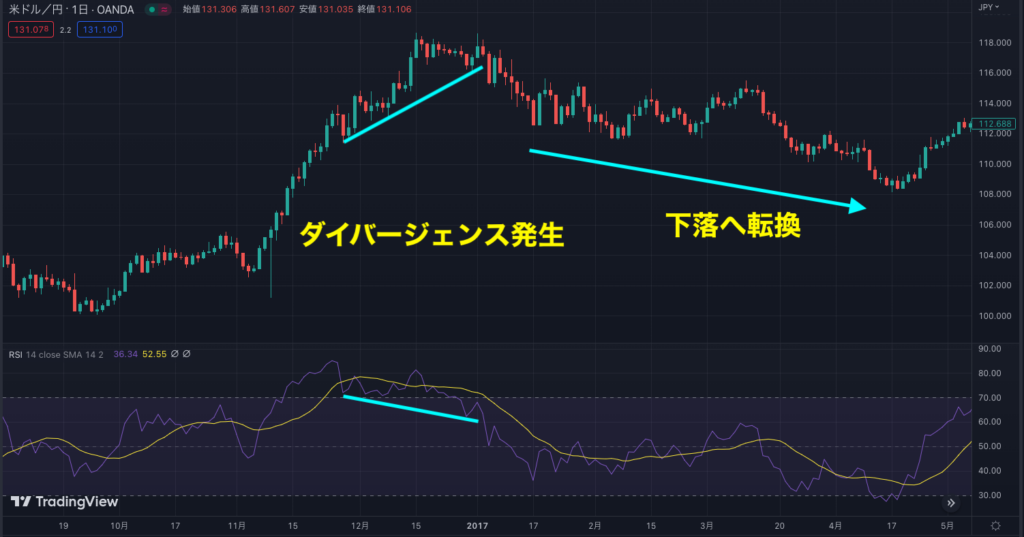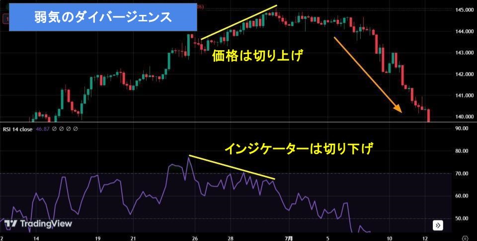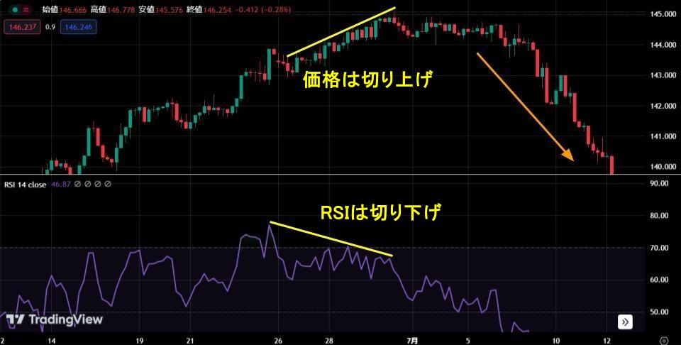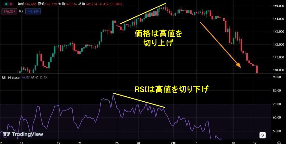 下図のようにチャートが高値を更新している一方でRSIが高値を切り下げている場合は、下降トレンドへの転換を予測して売りエントリーをするのが効果的です。
