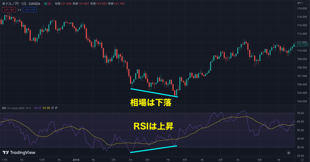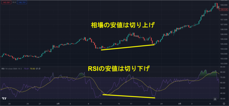 下図のように為替レートの安値が切り上がっている相場でRSIが安値を更新しているときは、上昇トレンドの継続が予測できます。