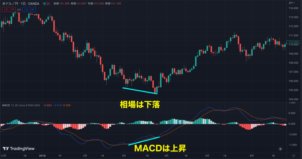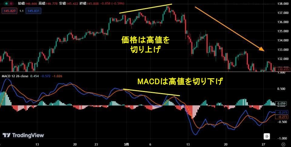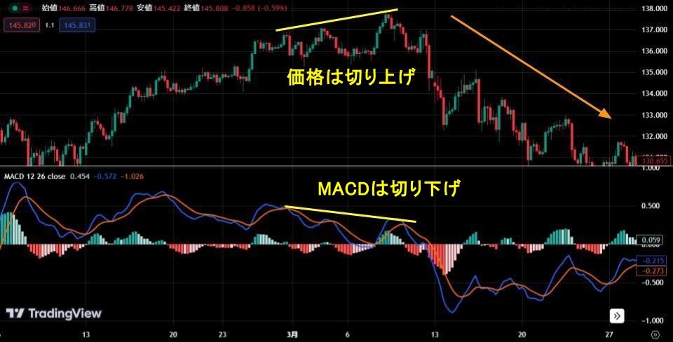 下図のようにチャートが高値を更新している場面で、MACD線が高値を更新せずに切り下げているときは、トレンド転換のサインとして活用できます。