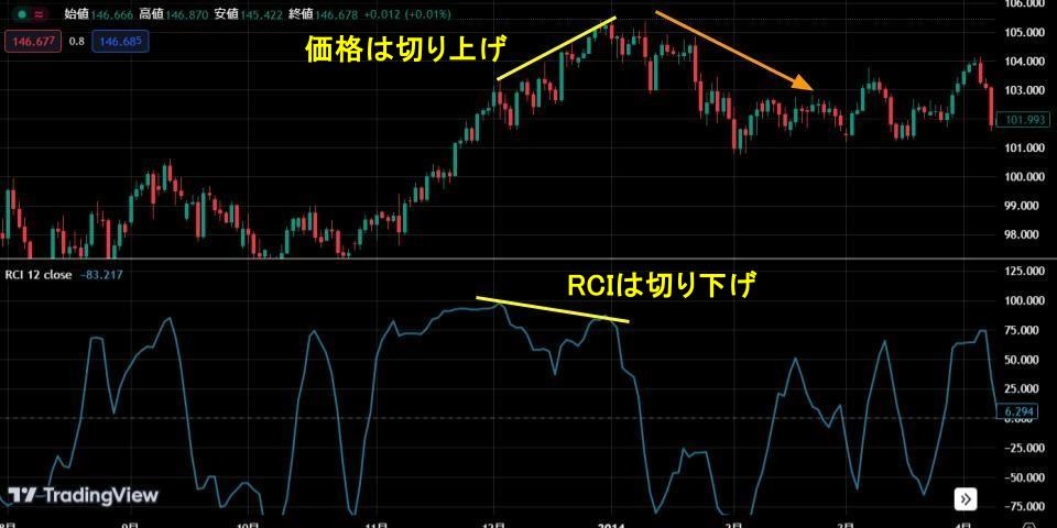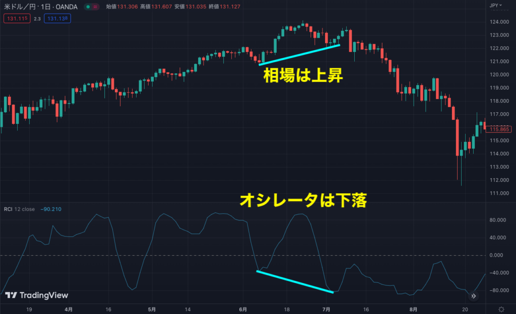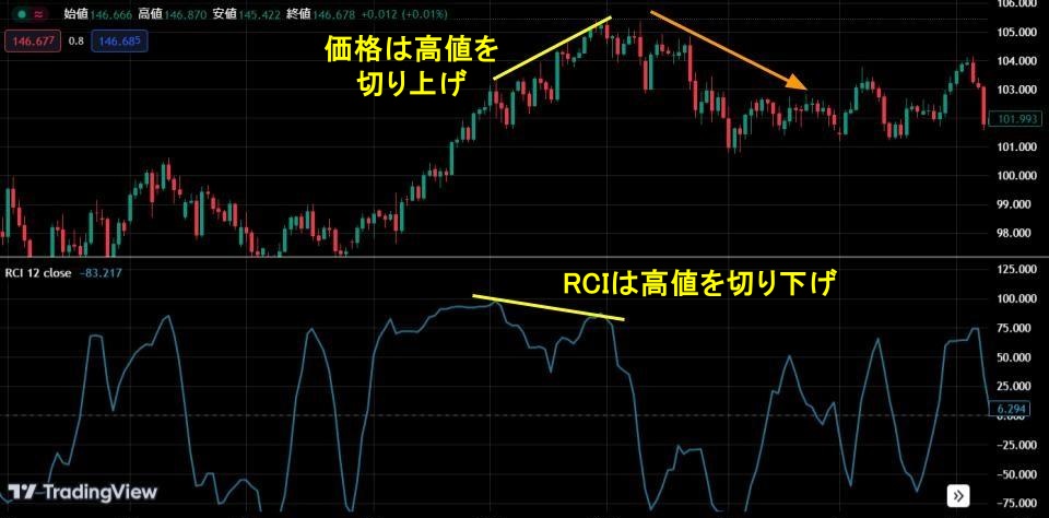 下図のようにチャートが高値を切り上げながら上昇しているにもかかわらず、RCIが高値を切り下げている場合は、売りエントリーを狙うのが効果的です。