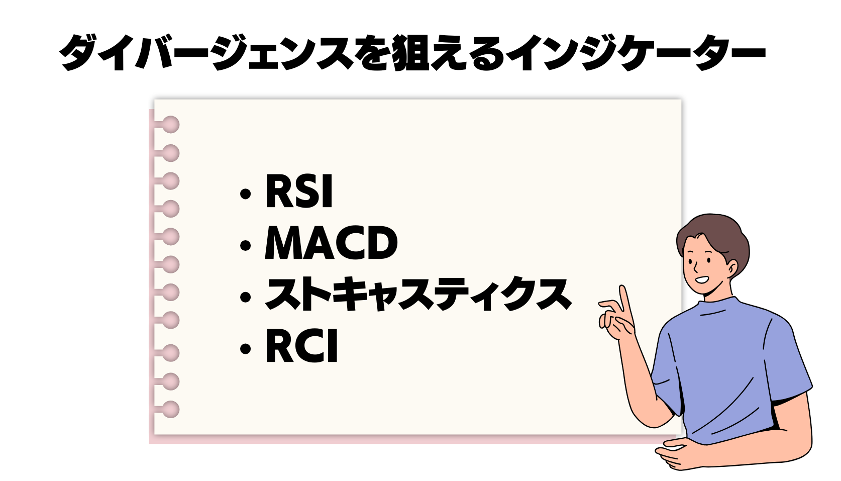 ダイバージェンスを狙えるインジケーターは、以下の通りです。