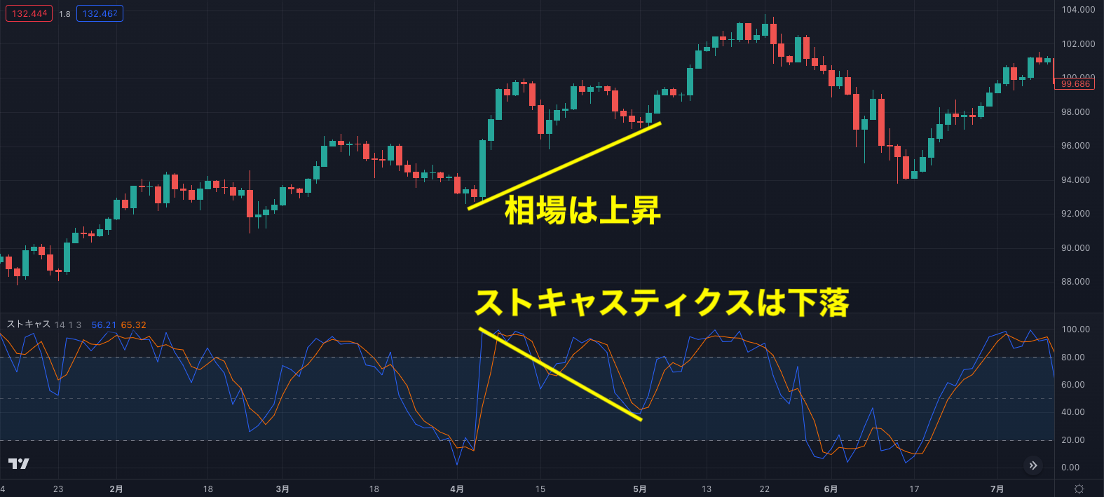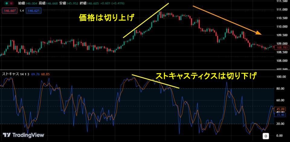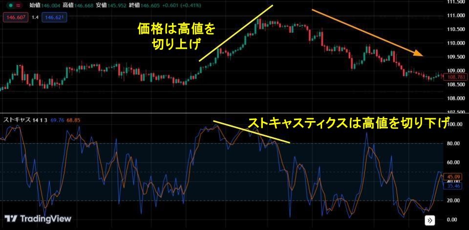 下図のように、相場が高値を更新している一方でストキャスティクスが高値を切り下げている場合は、売り注文をするのが効果的です。