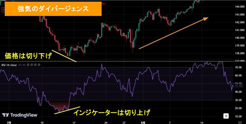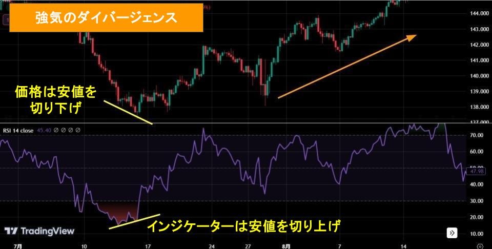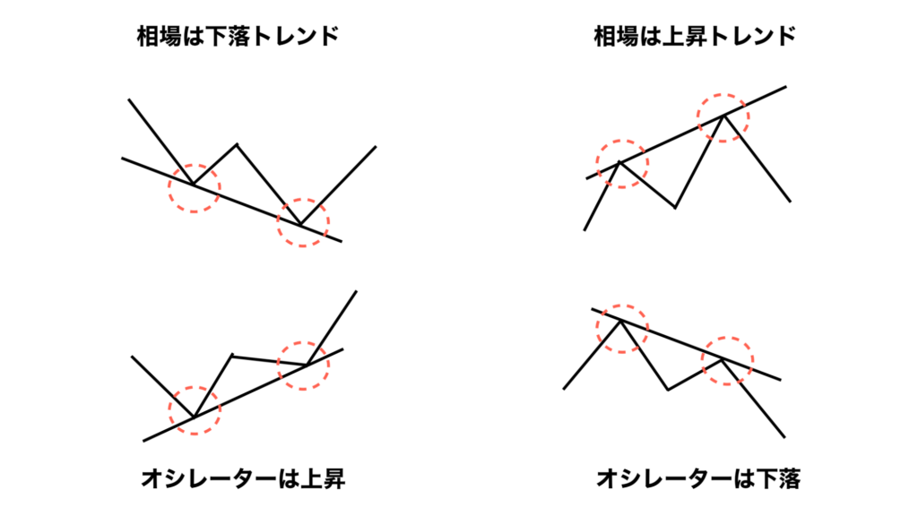 | 強気のダイバージェンス | 安値が切り下がっている | 安値が切り上がっている | 買い |