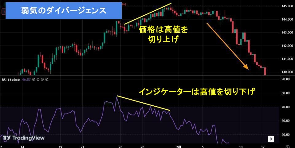 下図のようにチャートは高値を更新している一方、インジケーターが高値を切り下げているときは、下降トレンドに転じる可能性があるとされています。