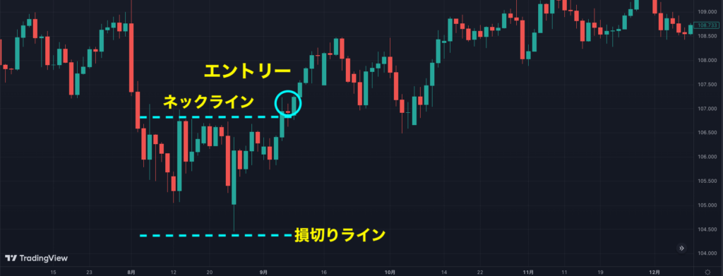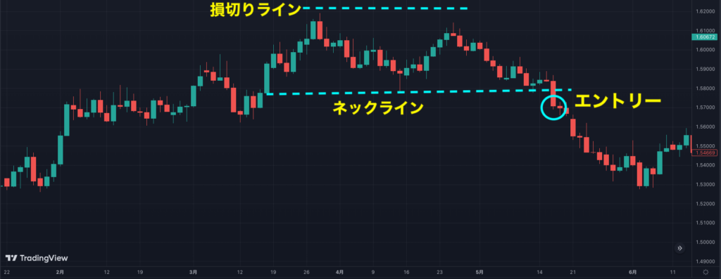 そして、一時的に下落した際の安値(ネックライン)を割れると、エントリーするタイミングです。