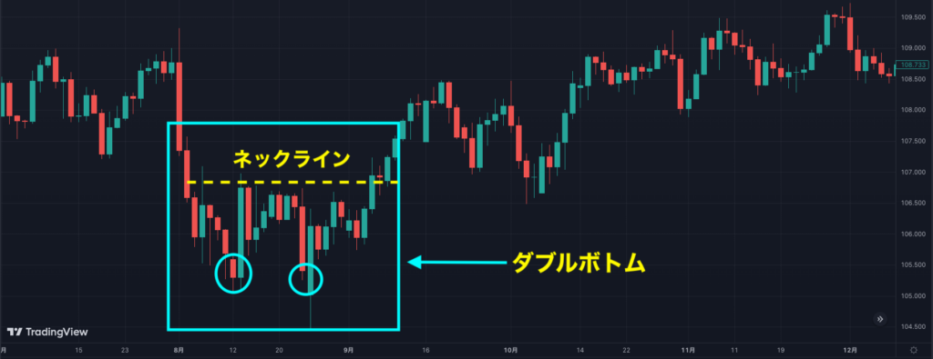 その状況でネックライン(1つ目の安値の後の直近高値)を超えることで、ダブルボトムが完成します。
