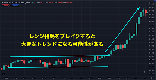 レンジ相場のサポートやレジスタンスをブレイクすると、大きなトレンドになるかもしれません。