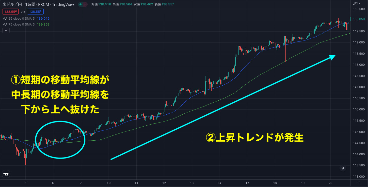| ゴールデンクロスの条件 | 短期の移動平均線が中長期の移動平均線を下から上に抜けた |