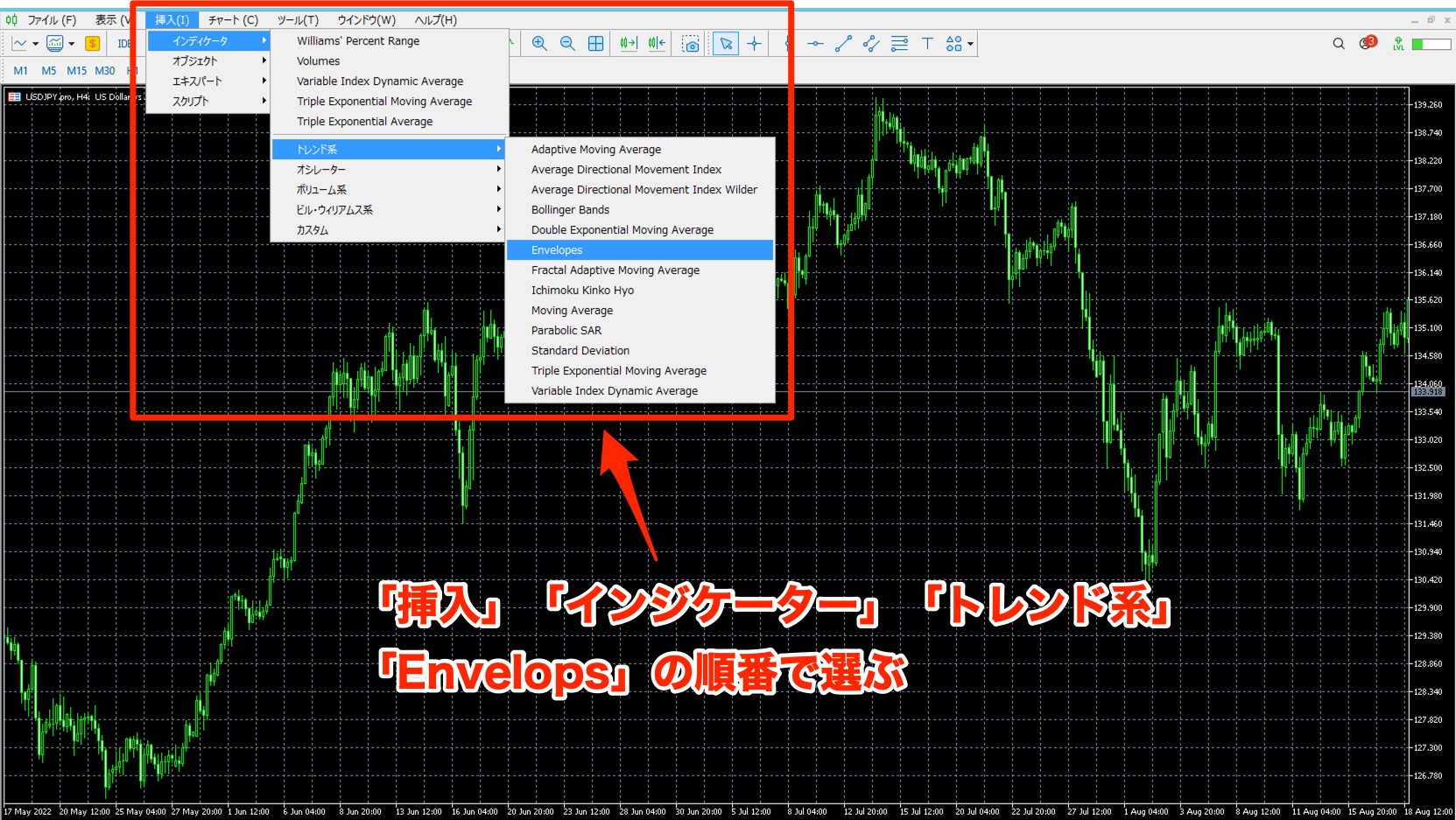 この章では、MT5を例にエンベロープを設定する方法を解説します。
