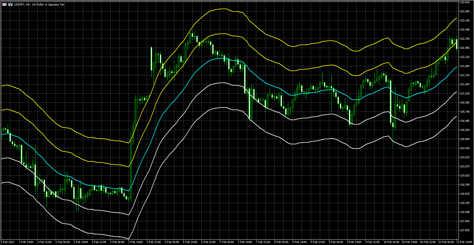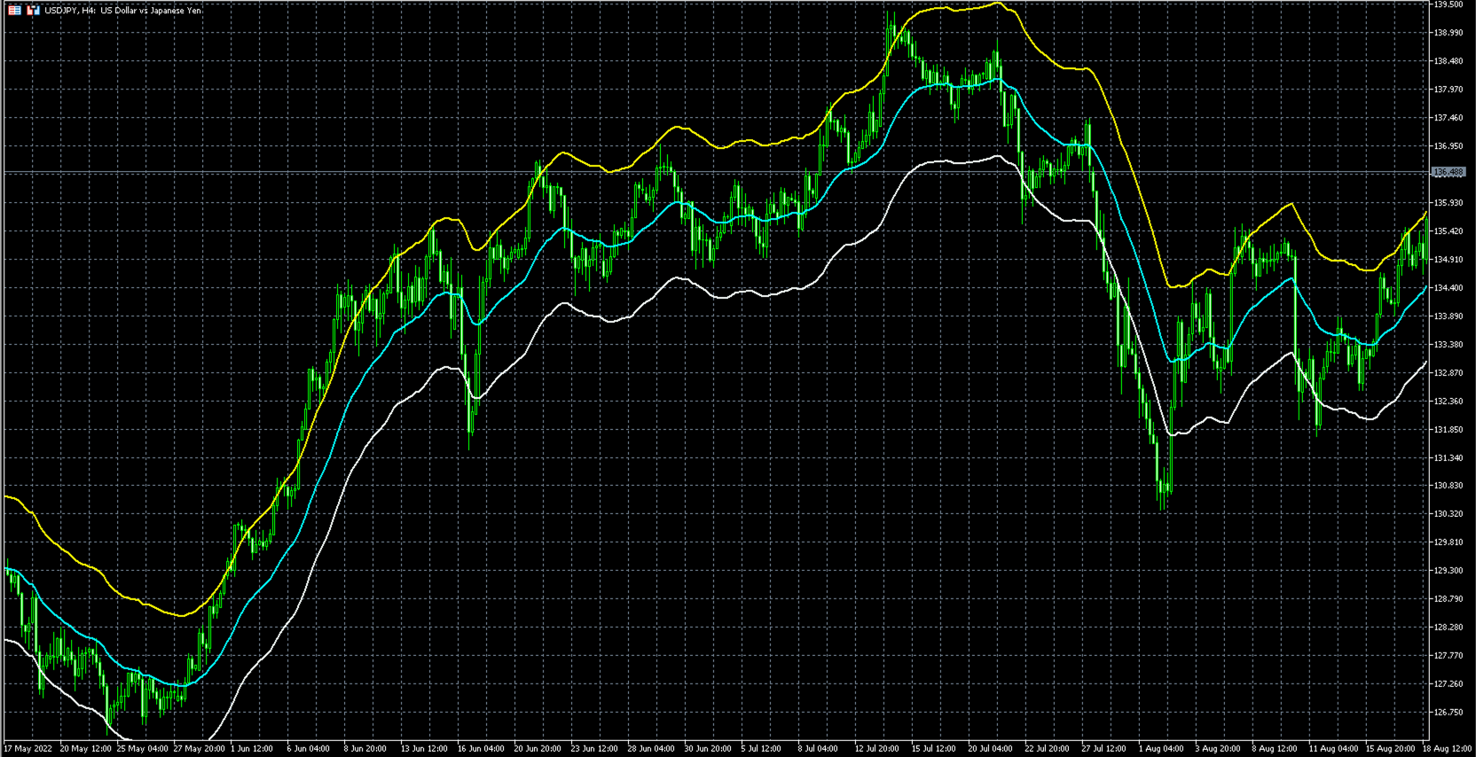 MT5にエンベロープを表示されました。チャートの青いラインと赤いラインがエンベロープ、中央の黄色いラインは移動平均線です。