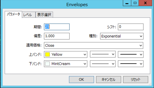 | 適用価格 | エンベロープの移動平均線の計算に使う値を選択できる(Closeなら終値、Openなら始値といったように9種類ある) |