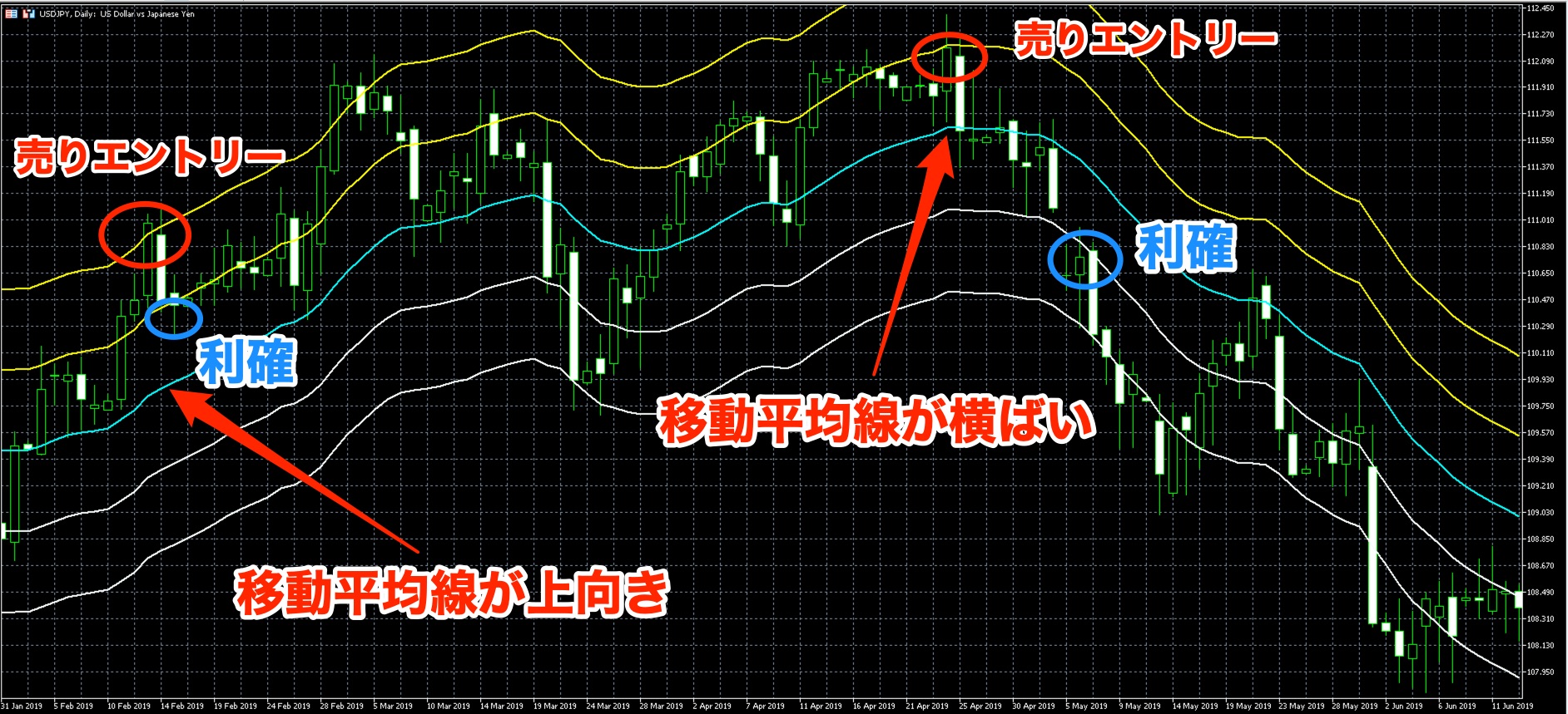 次に売る場合を例に解説すると、以下のように赤い丸で売ります。そして、利確をする箇所は、エントリーしたバンドの位置、移動平均線の向きを見て判断してみましょう。