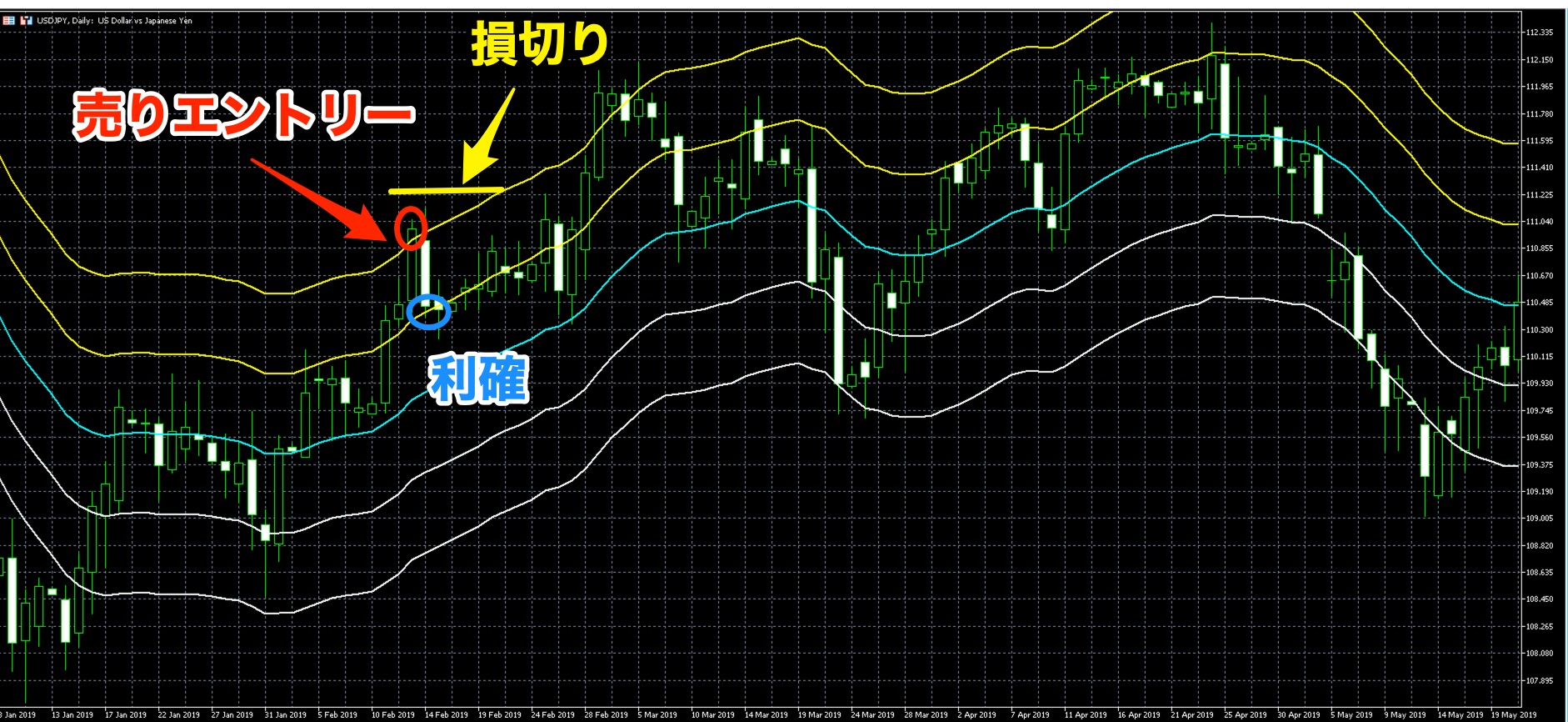 なお、損切りは1つ上側のバンドを上抜けたタイミングです。