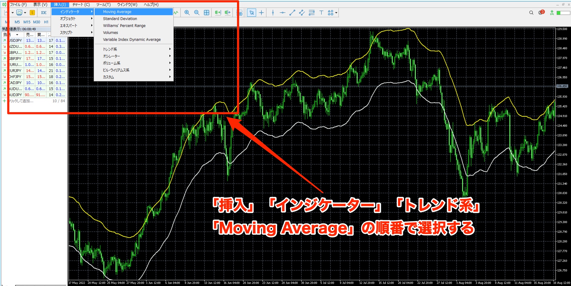 次に移動平均線を追加します。「挿入」「インジケーター」「トレンド系」「Moving Average」の順番で選択してみましょう。