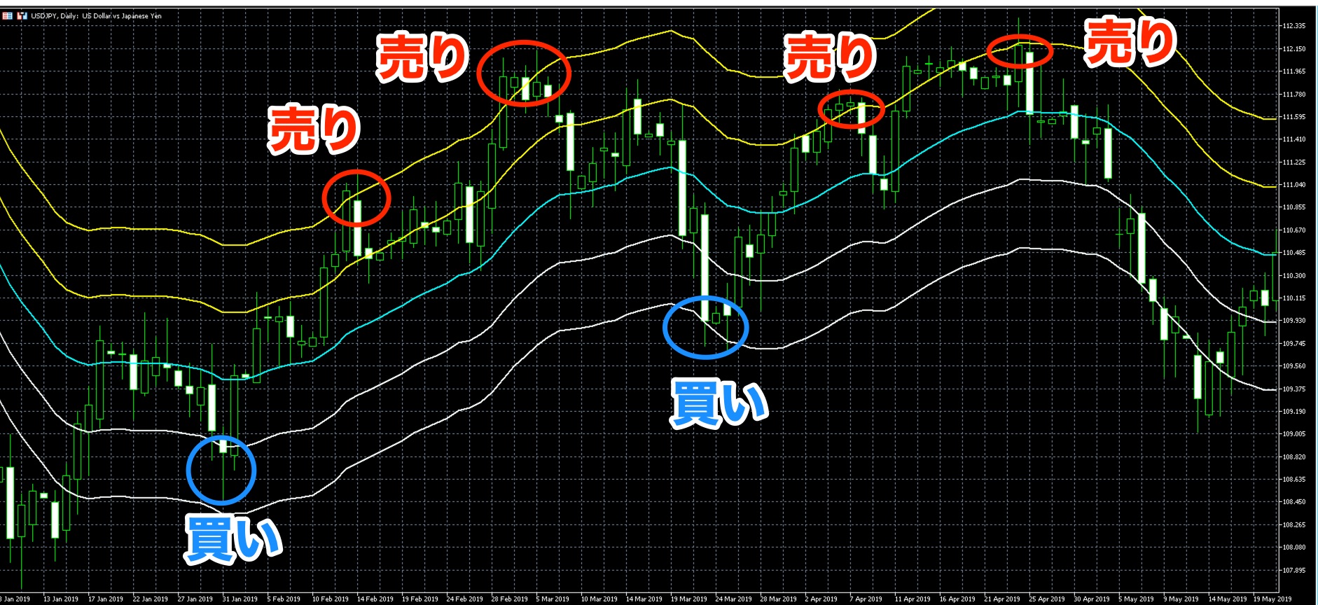- 価格が下側のバンドに近づいたら売られすぎと判断して買う