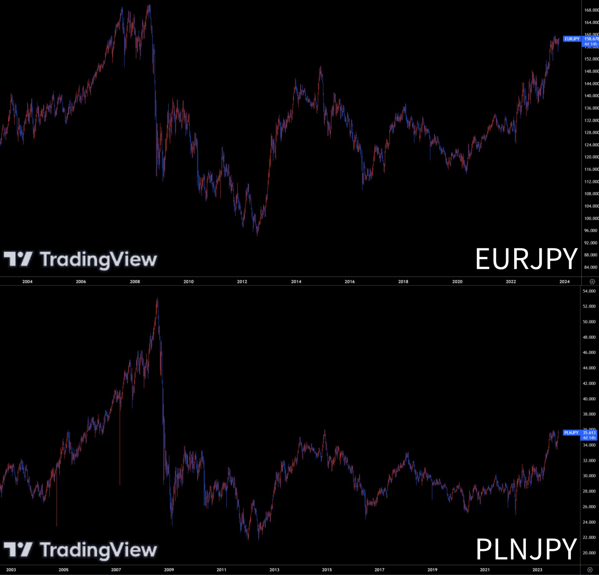 下図の2000年前半から現在までのユーロ円とズロチ円のチャートを比較すると、似た値動きのチャートが形成されていることがわかります。