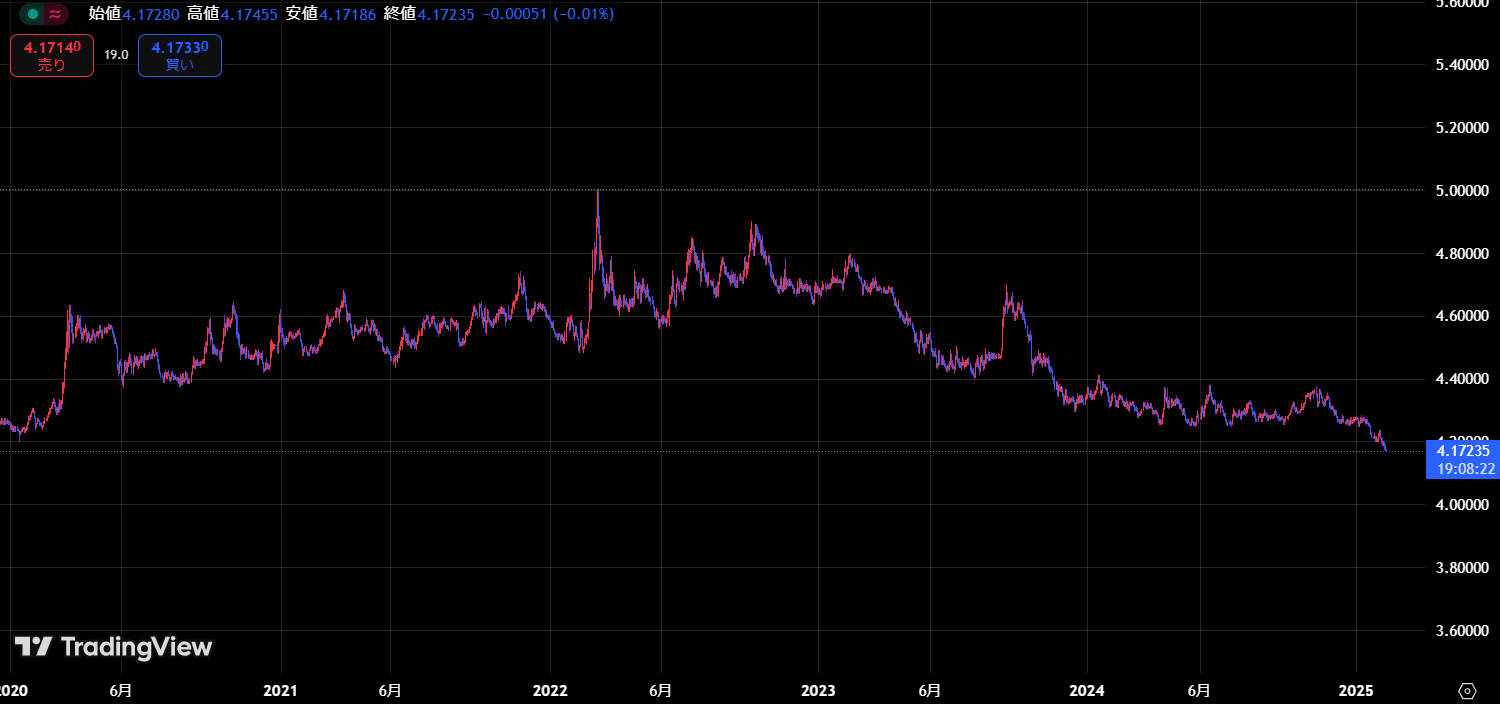 下図は、ユーロズロチの2020年から2025年までのチャートです。