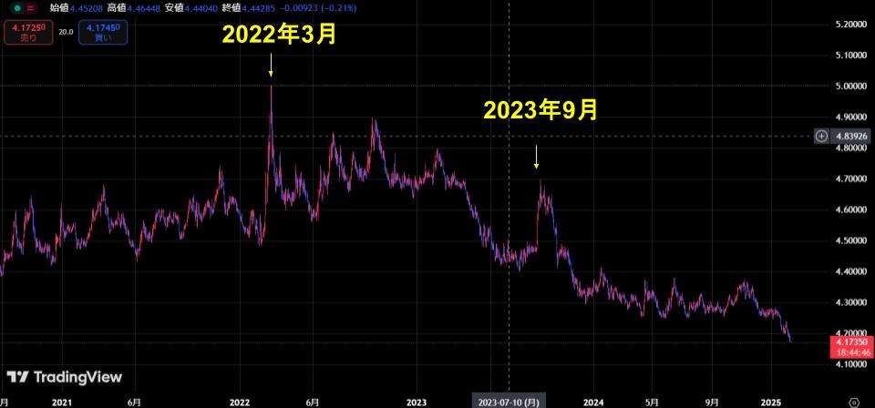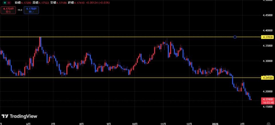 ユーロズロチの日足チャートでは、2024年に形成されていたレンジ相場の安値を2025年に入ってから抜けたことが確認できます。