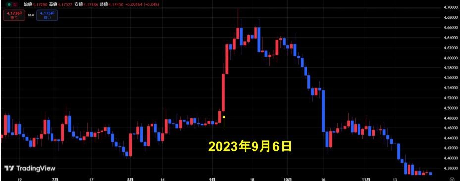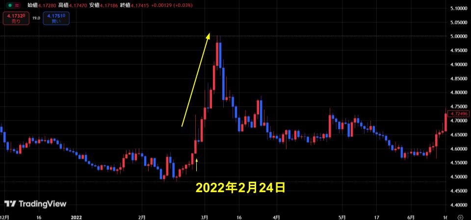 ここでは、ユーロズロチで価格の急変が見られた2022年2~3月と2023年9月の相場を見ていきましょう。