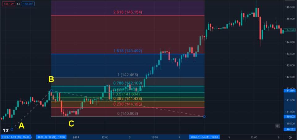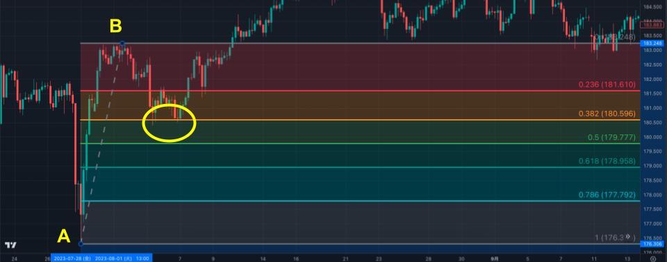 Aから下落していますが、38.2%付近(オレンジ色のライン)と重なったあたりで反発していることがわかります。