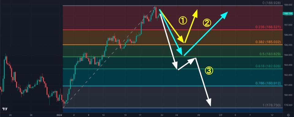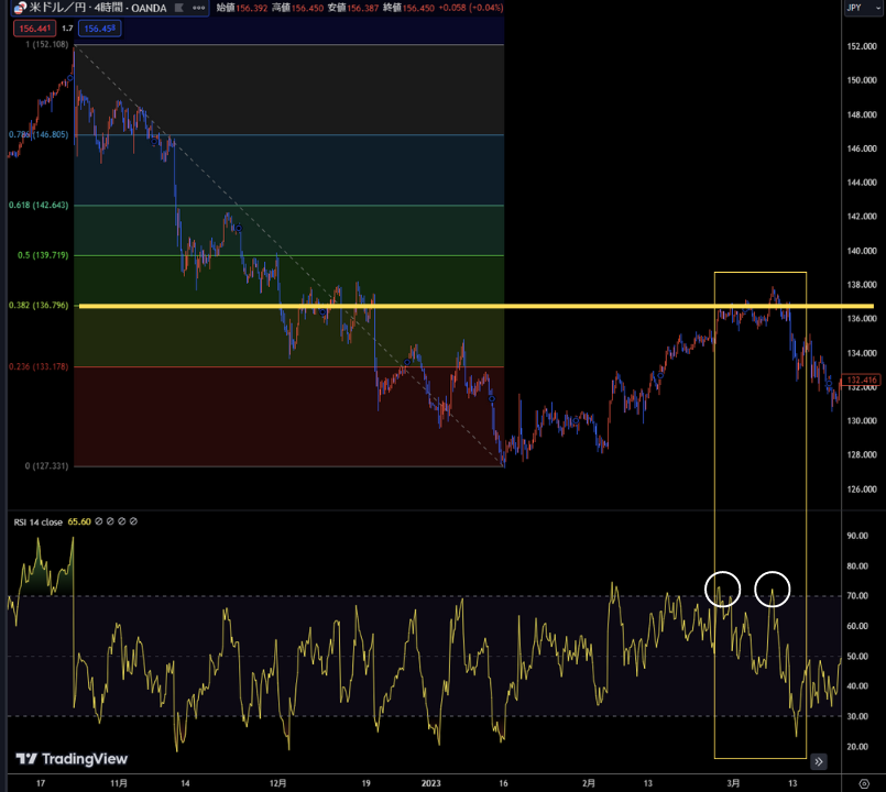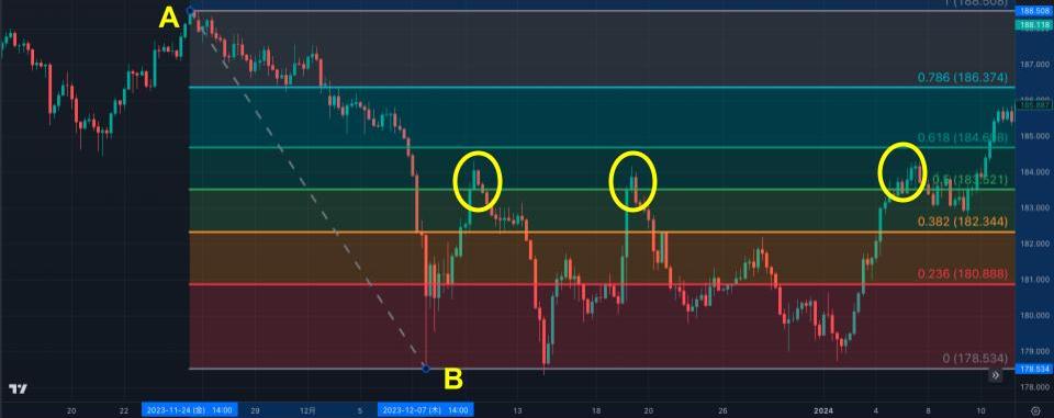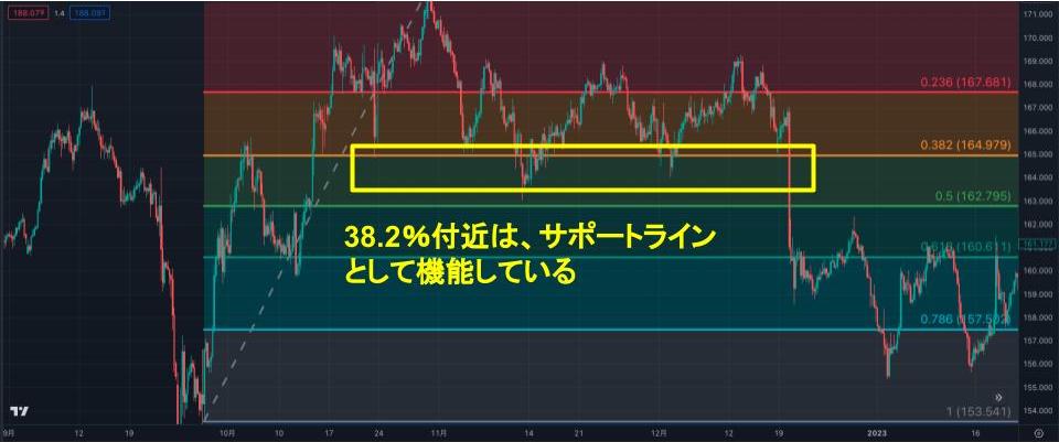 特に価格の反転が起こりやすいとされているのは「23.6%」「38.2%」「61.8%」のラインです。