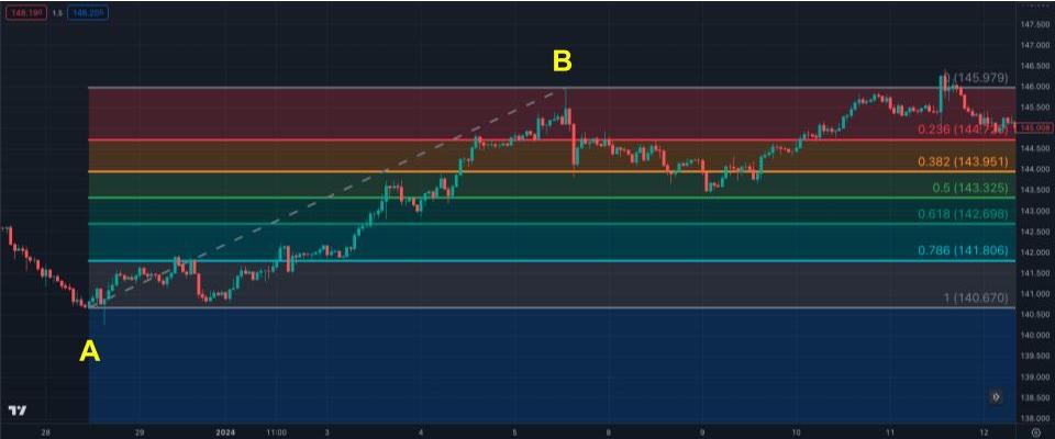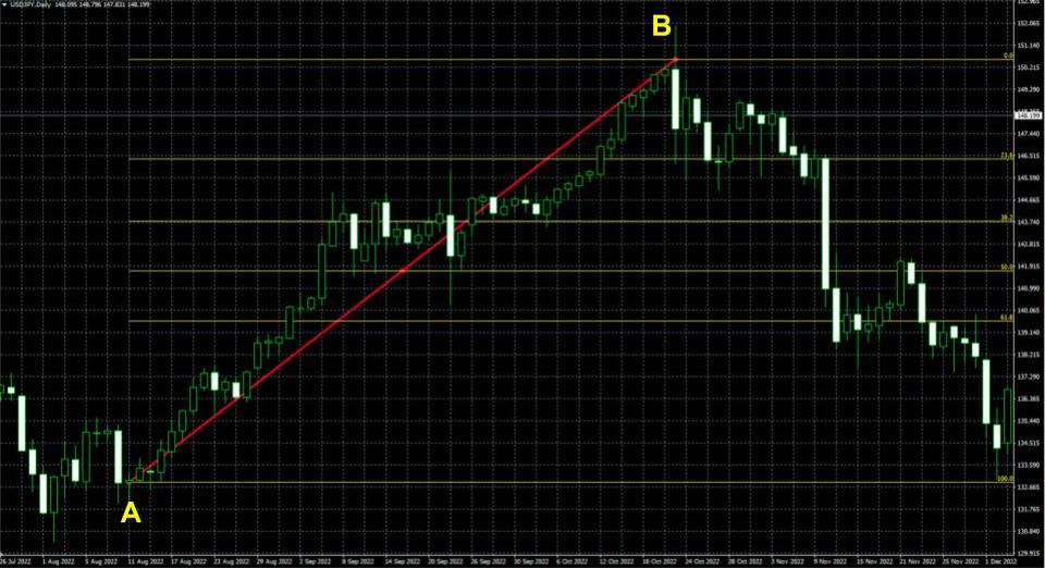 直近で上昇トレンドが発生した場合は、下図のように直近の安値Aと高値Bでフィボナッチリトレースメントを引くと、価格の反落が起こりやすい価格帯を予測しやすくなります。