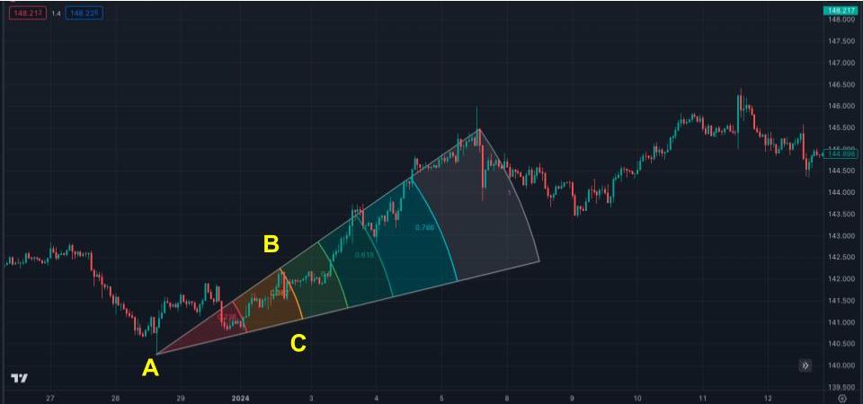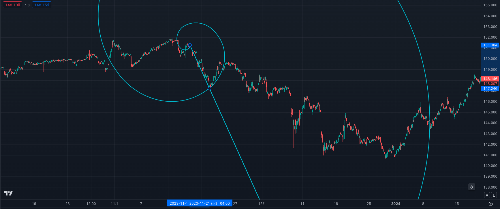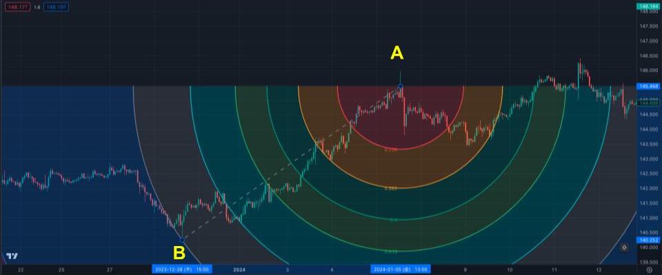 フィボナッチアークとは、時間的概念を取り入れたフィボナッチの一種で、押し目買いや戻り売りのタイミングを判断するために使います。