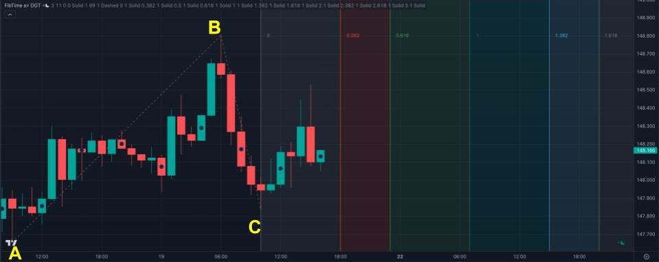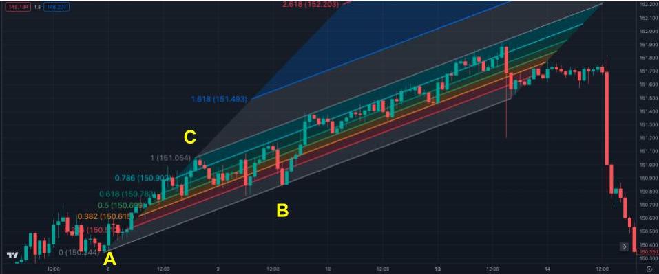 下図のようにA、B、Cの3点を描画したら、Cを起点にどこまでトレンドが伸びるかを予測します。