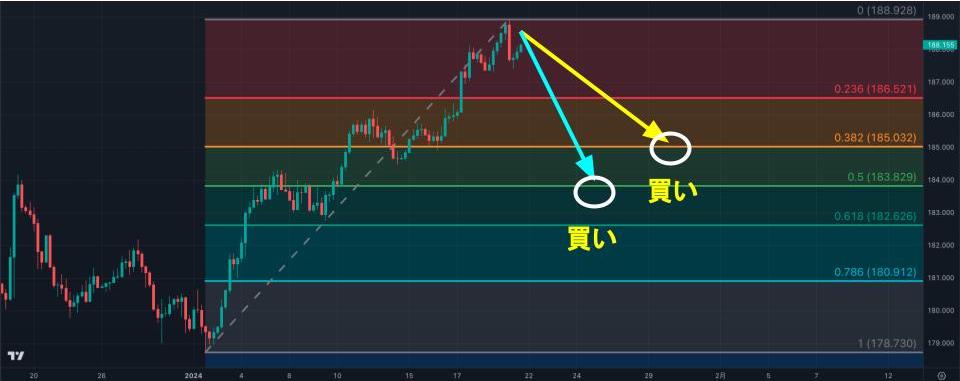 下落幅が小さいほど上昇への勢いは強いため、23.6%あるいは38.2%で買いエントリーをすると、多くの利益を狙える可能性があります。