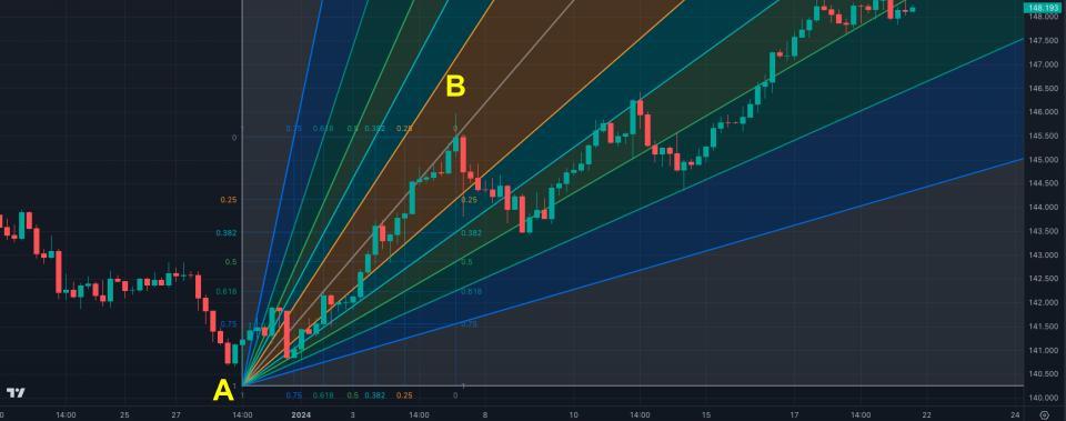 上昇トレンドでは直近の安値を始点、直近の高値を終点、下降トレンドでは直近の高値を始点、直近の安値を終点としてラインを引き、反発するポイントを予測します。