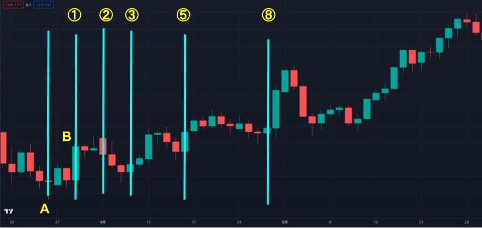 それぞれの垂直線で、価格の反転が起こりやすいと分析し、トレードに活用します。