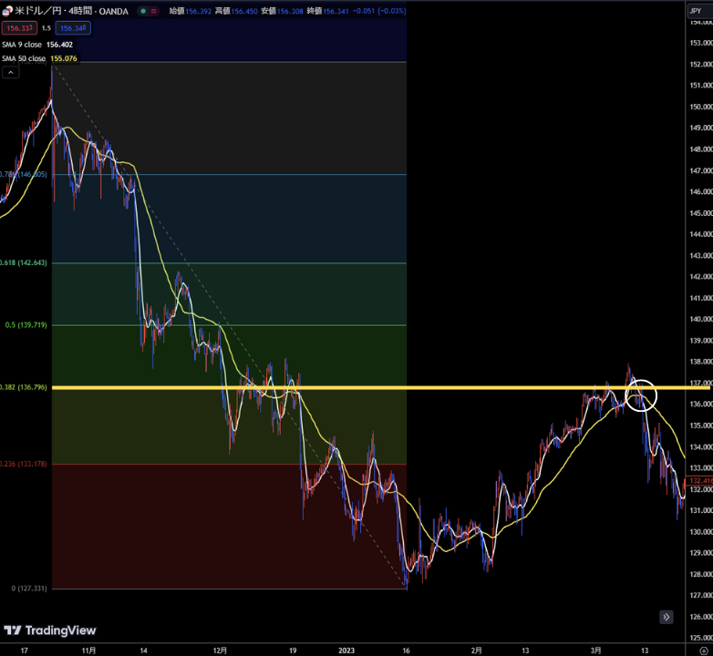フィボナッチリトレースメントの50%付近で何度も上昇が止まっていることがわかります。