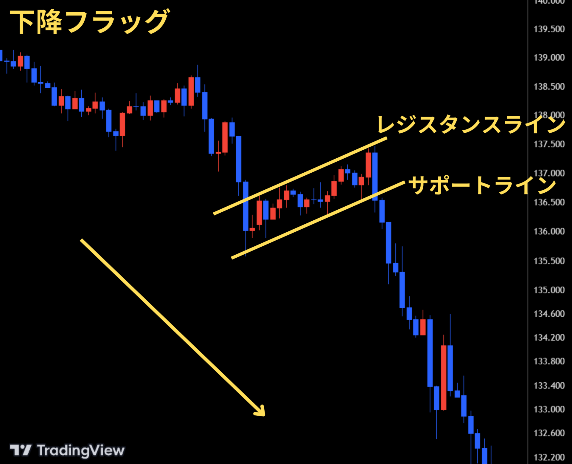 トレンド発生中の一時的な反発点で発生し、フラッグ出現後は再びトレンドが継続する傾向にあります。