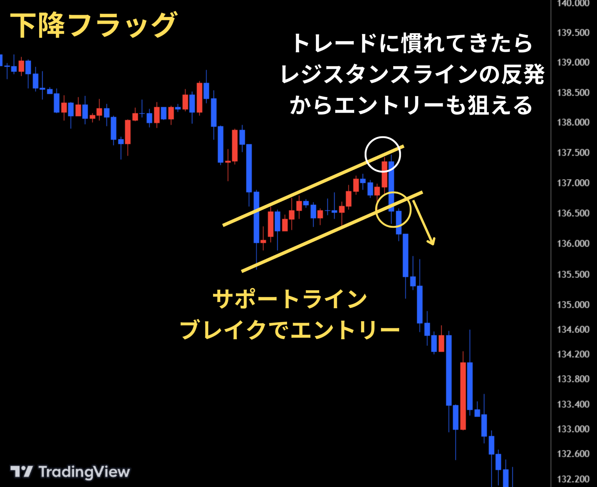 (下降フラッグの場合は、逆に売り方向でのエントリーとなります。)