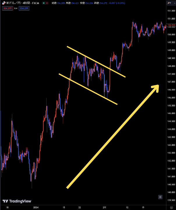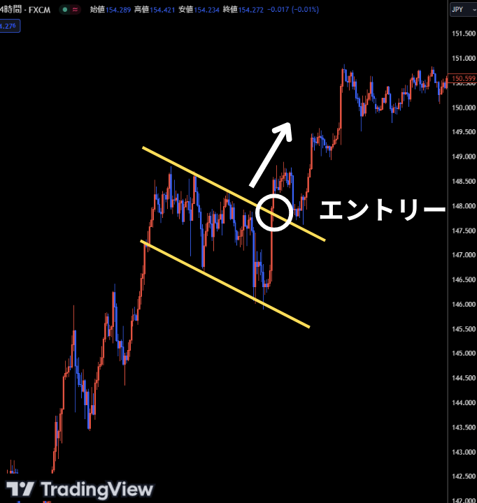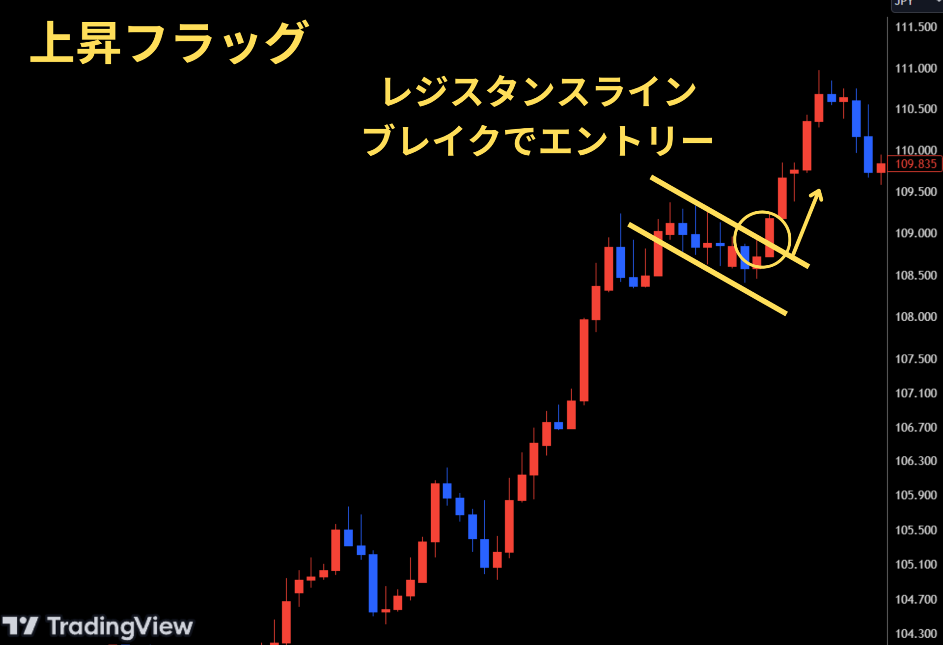上昇フラッグであれば上昇トレンド中の押し目として出現するため、フラッグ中の買いエントリーで再び上昇トレンドに乗れるチャンスを掴めます。