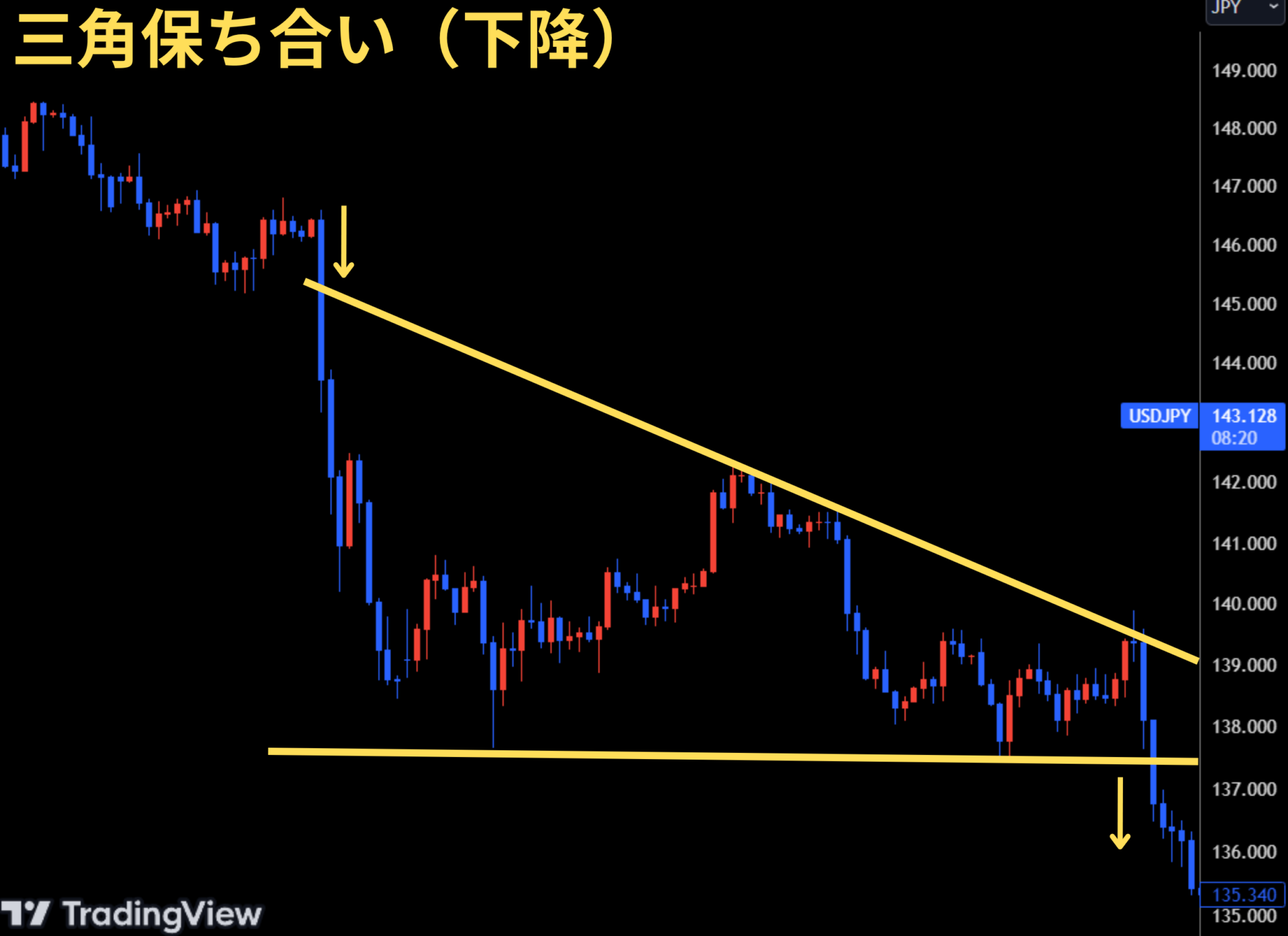 チャートは一定期間ライン内を行ったり来たりした後、下側のトレンドブレイクすると再び下降トレンドが継続します。