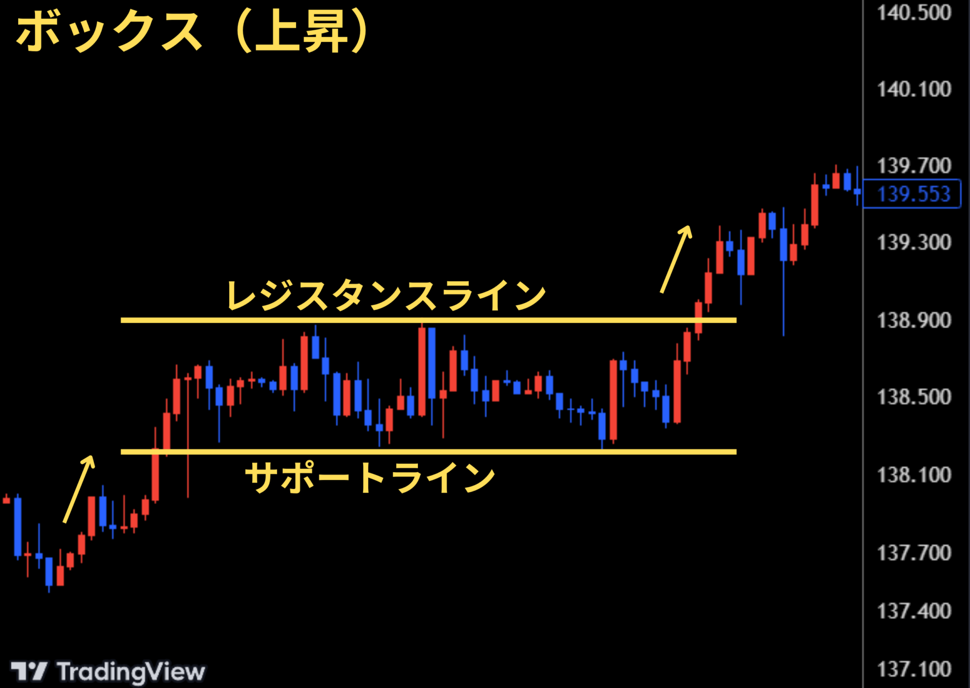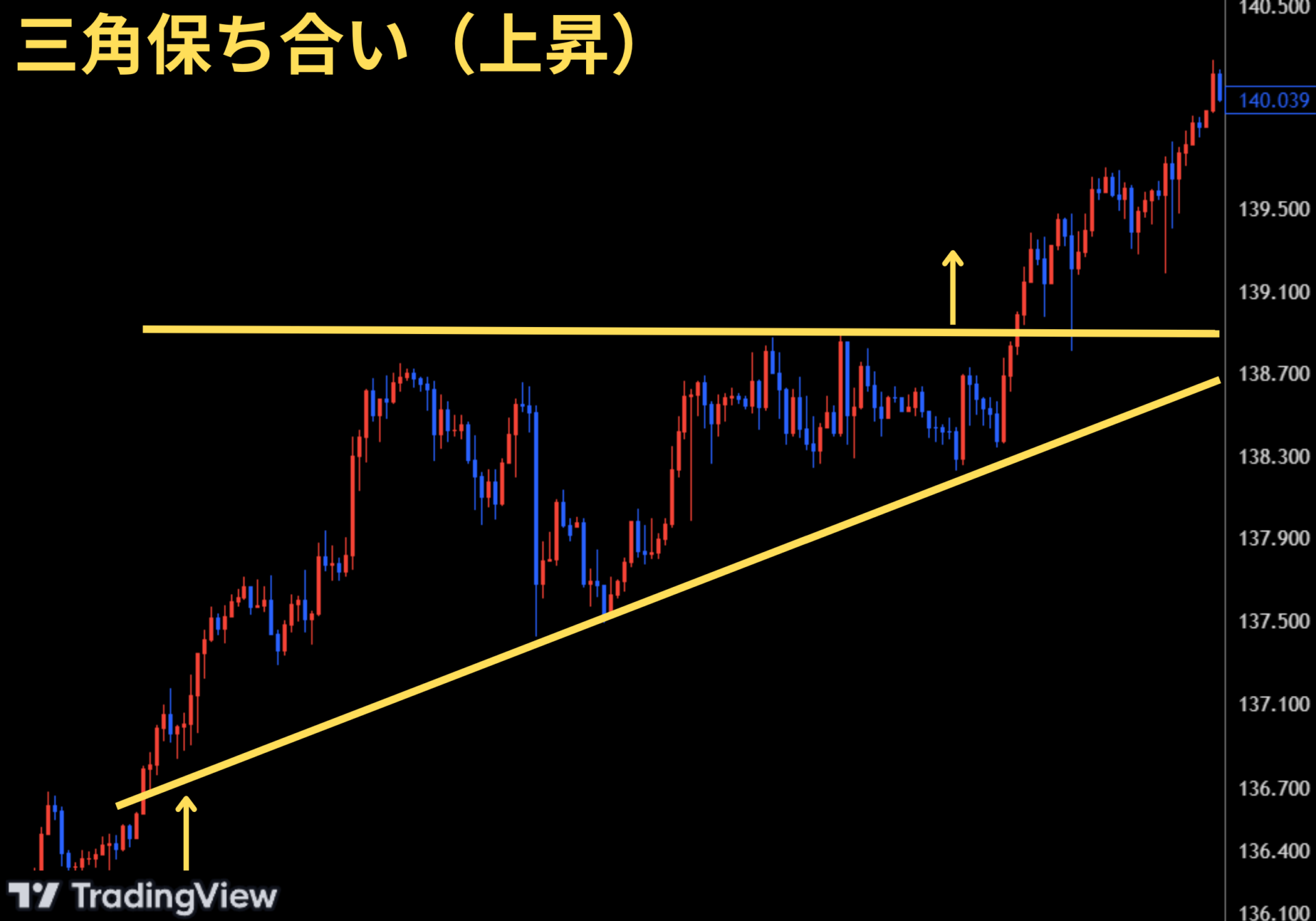 チャートは一定期間ライン内を行ったり来たりした後、上側のトレンドラインをブレイクすると再び上昇トレンドが継続します。