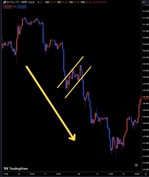 下降トレンド中の一時的な戻りとして出現するため、次の下降トレンドを狙えるポイントになりやすいです。