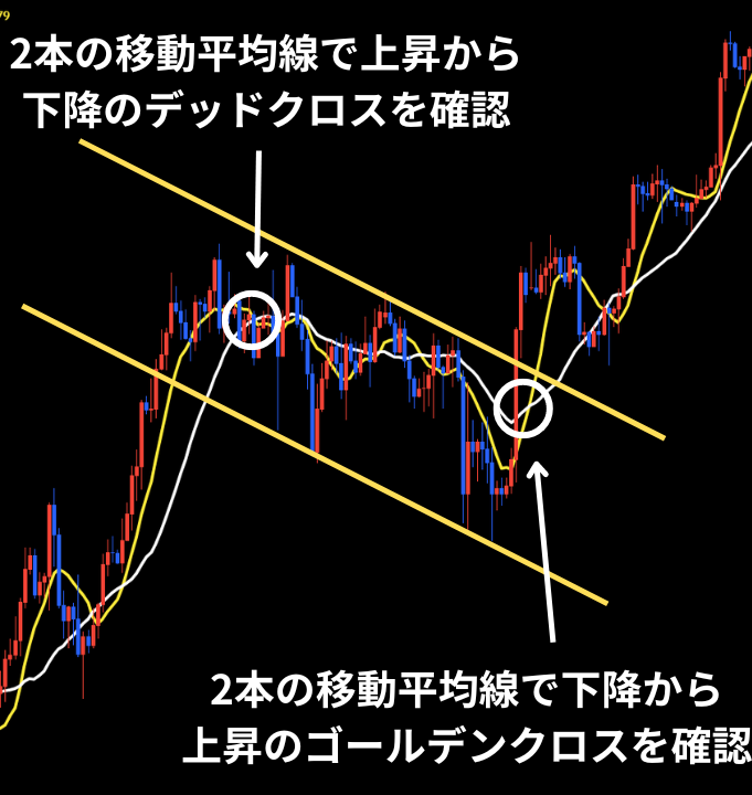 ちなみに、トレンドラインは1本でも傾きによってトレンド転換を把握できますが、2本の期間が異なるトレンドラインを用いてゴールデンクロスやデッドクロスを使えば、確実にトレンドラインを把握できるため、トレンドの把握に自信がない場合は2本のトレンドラインを使ってみましょう。